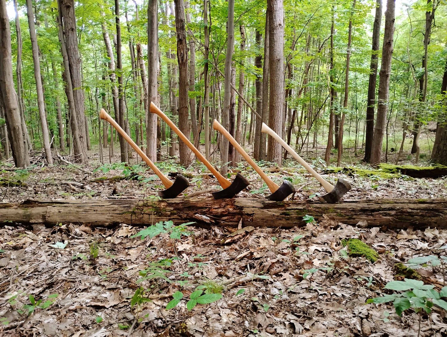 We sell handles with minimal runout and excellent grain orientation. A very tedious sawing process makes this possible. Given proper grain orientation and minimal grain runout, in our experience, few handles fail from other than abuse. Traditionally, axe handles were made with the most suitable species of the regionally available choices. In different areas of Europe, ash, beech, oak, birch and hornbeam best filled that box. In Australia, spotted gum, in Canada, ash, and in different parts of the US, hickory, ash, white oak, maple, yellow birch, elm, hornbeam, osage orange and surely many others were used. With the development of the rail system and reliable interstate commerce hickory quickly became king. Our principal handle woods are hickory and white ash. We offer a few patterns in yellow birch and white oak. For a deeper dive into wood properties check out Mechanical Properties of Wood. The most significant property for handles is the impact bending listed on page 4, described on page 3.